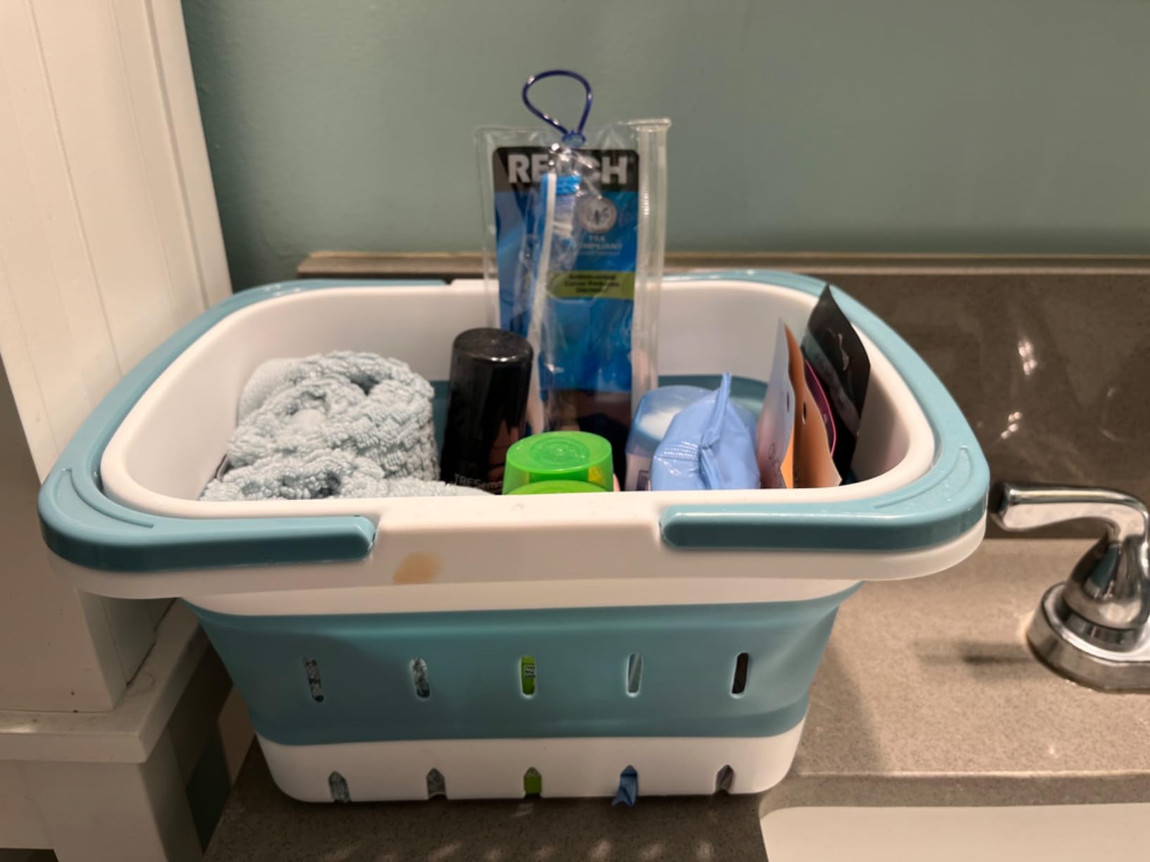 Collapsible caddies and basins maximize storage, perfect for small spaces like dorms, apartments, or camping setups.